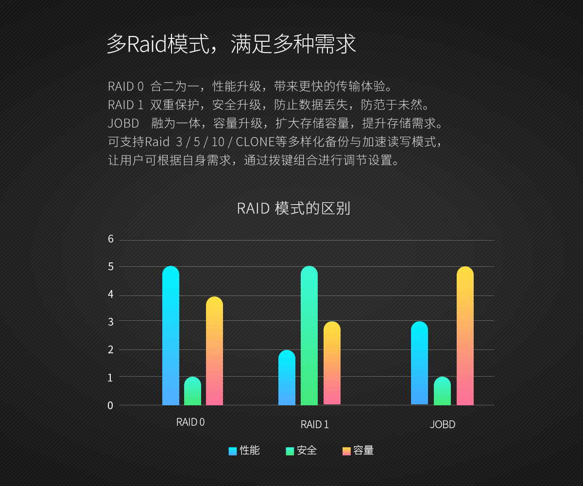 RAID 0/ 1/ 3/ 5/ 10/ JBOD/ Combine