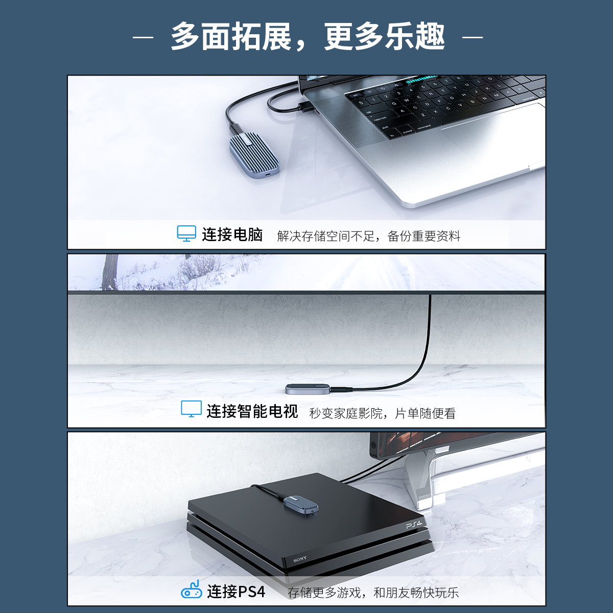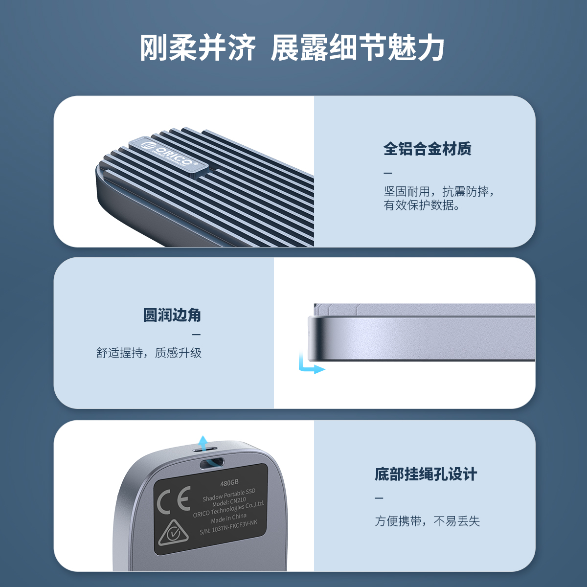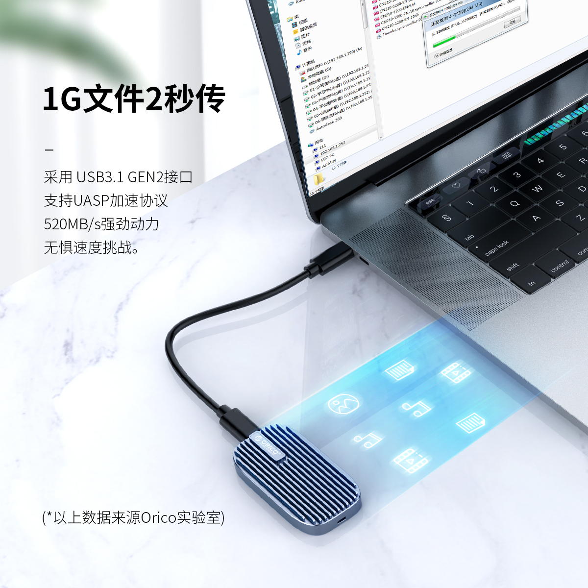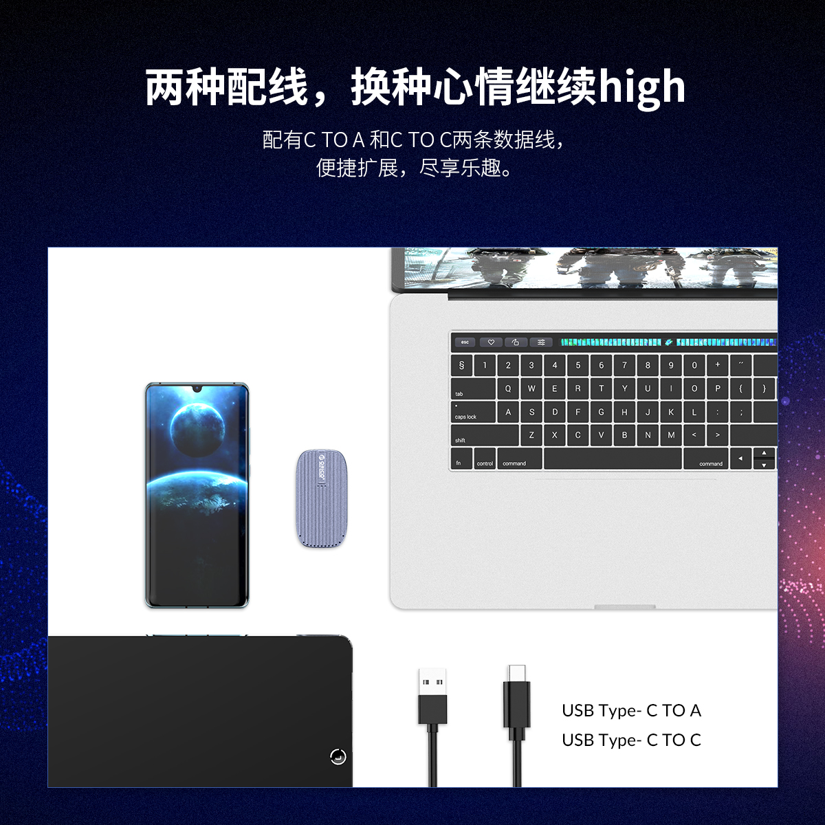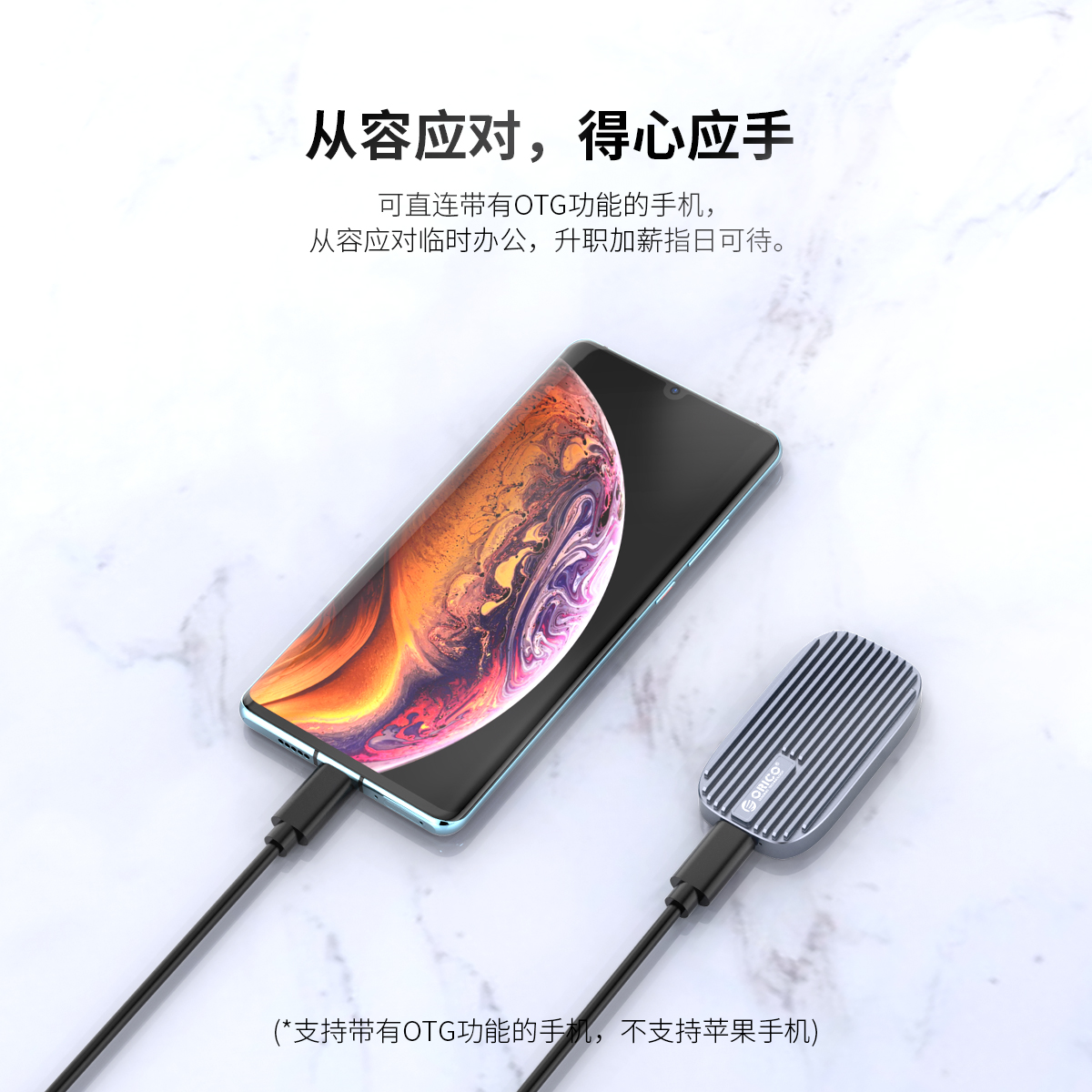 USB 3.1固態移動硬盤,OTG功能,支持UASP加速協議,52OMB/s強勁動力,配有一條CTOA和C TOC二合一數據線,