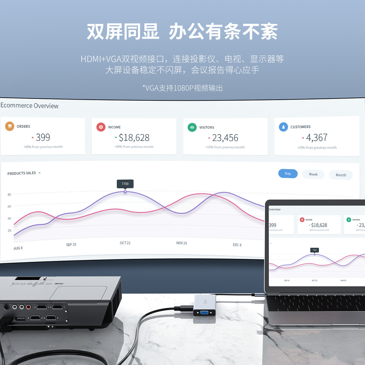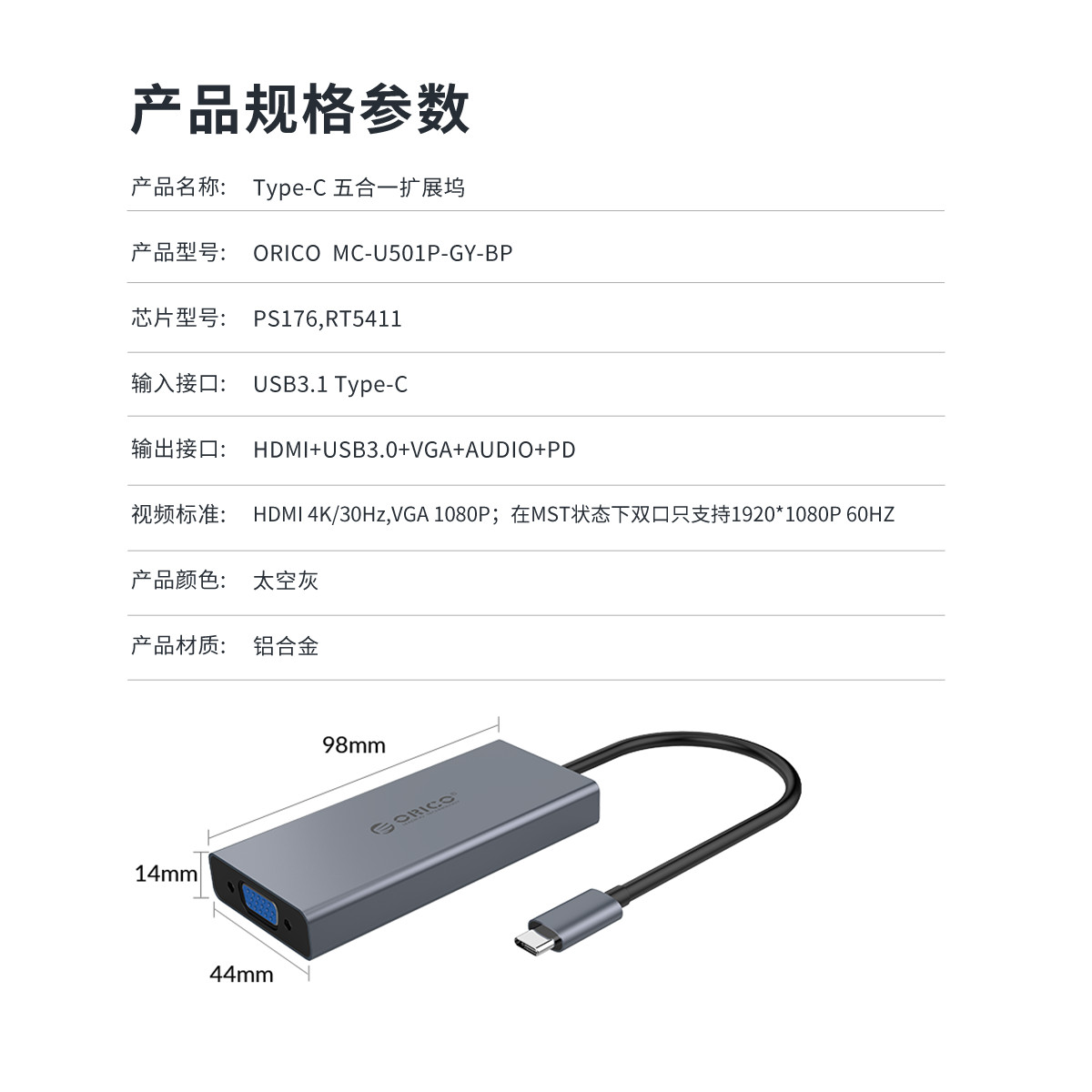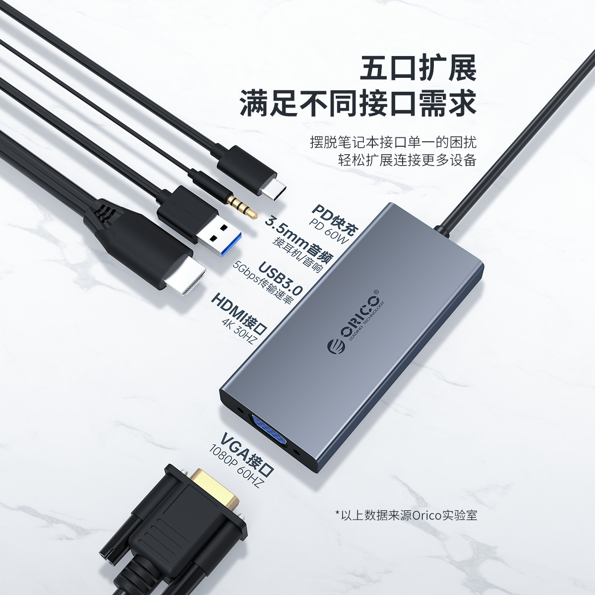 五口擴展,USB Type-C口支持PD2.0,HDMI支持4K 30HZ視頻傳輸,HDMI+VGA雙視頻接口,標準的DC3.5MM音頻接口,內置數字音頻編解碼器