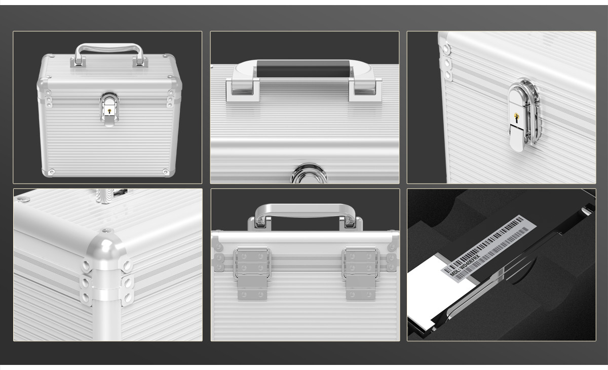 美國(guó)式把手,把手底部帶橡膠包邊,手感更佳,方便外出攜帶;(5盤位不帶橡膠包邊),重鎖設(shè)計(jì),一是鑰匙鎖,二是常見的鎖扣,確保硬盤安全;全角度鐵皮角固定,保護(hù)箱的八個(gè)角都有鐵皮固定,使其更加穩(wěn)固耐用;六孔后扣,背后采用六個(gè)孔位 *2 的固定扣位,固定上下蓋;人性化手指位,貼心手指位,硬盤拿放更方便;