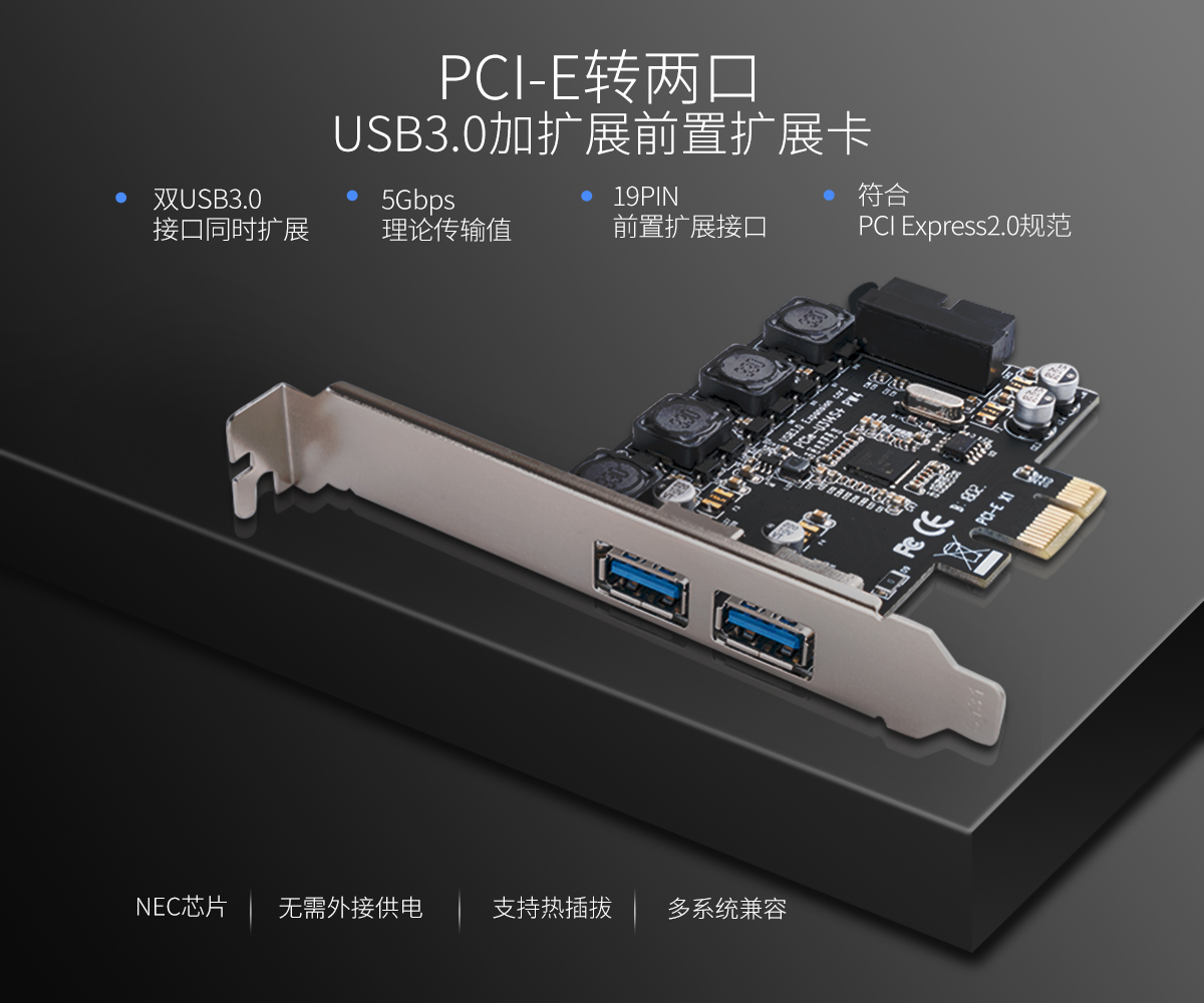 2口USB3.0 臺式機PCI-E擴展卡,兼容PCI-E X1/4/8/16