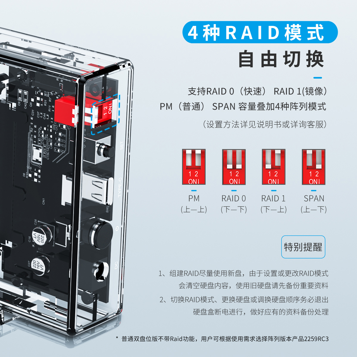 雙盤8T大容量,免工具快裝,HDD/SDD盤兼容,4種RAID模式,自由切換