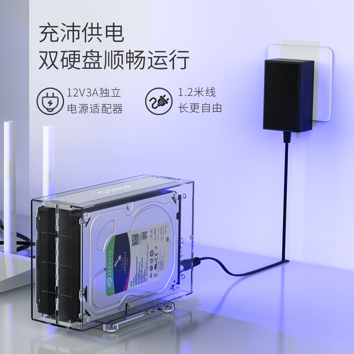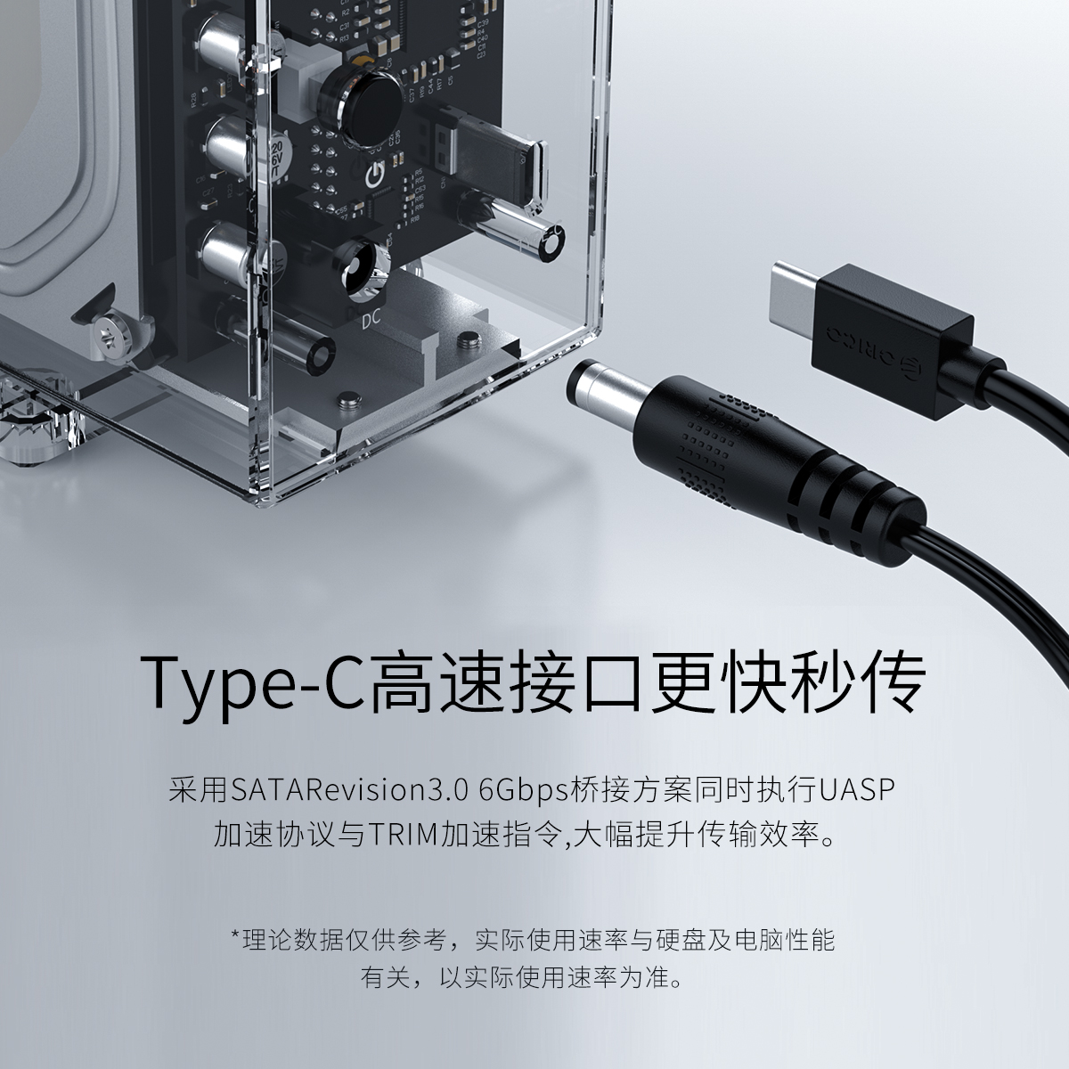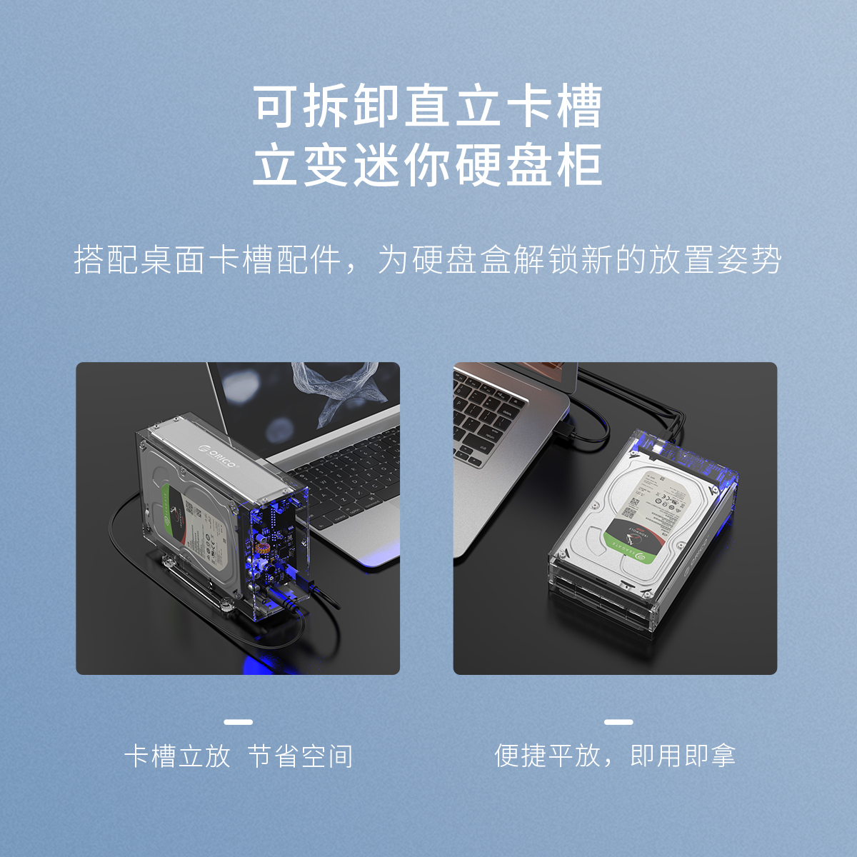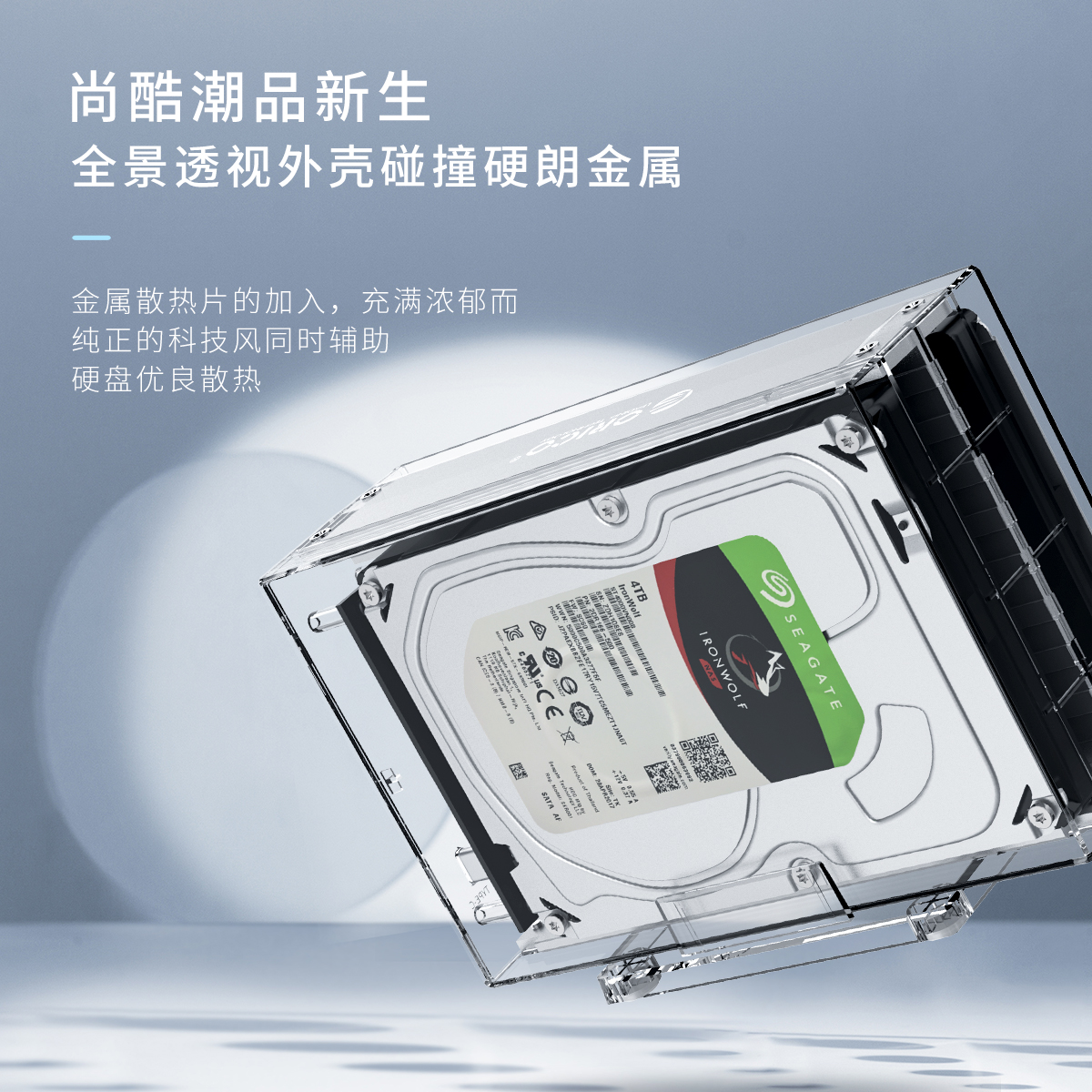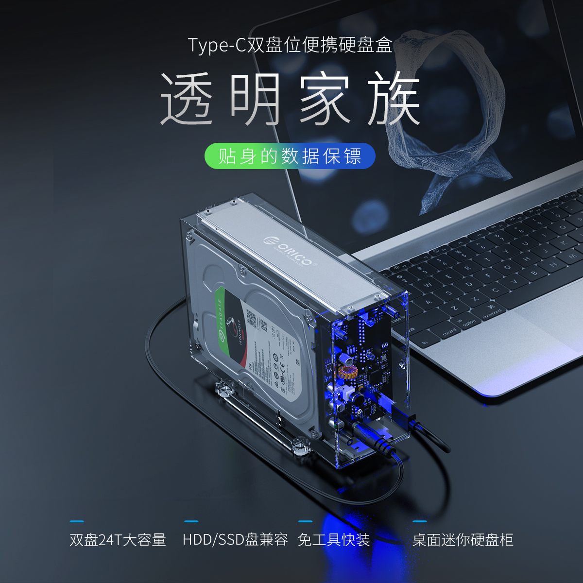 全景透視外殼,盡顯透明真芯,雙盤24T大容量,免工具快速安裝,當你的桌面迷你硬盤柜