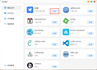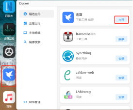 點擊首頁的“Docker”,進到Docker應用界面。 在“精選應用”可以看到一些設置好默認參數了的Docker容器,只需點擊安裝即可使用。